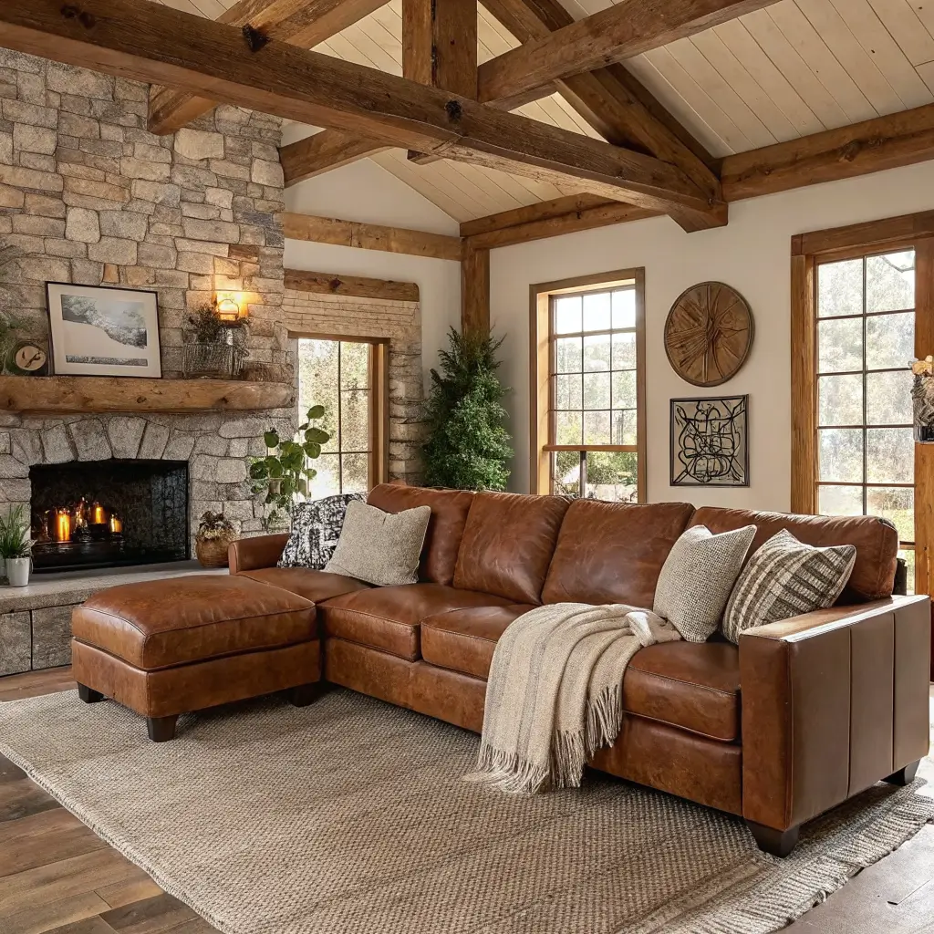 Now we’re talking my language! Ever walked into a cabin and immediately wanted to curl up with hot cocoa? That’s the vibe we’re going for here. A rustic sectional setup brings all those warm, fuzzy feelings right into your living room.