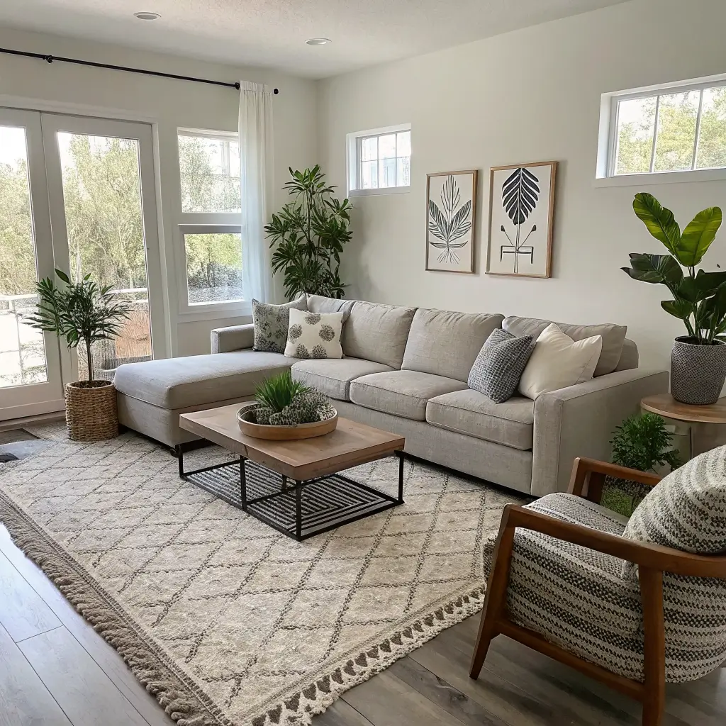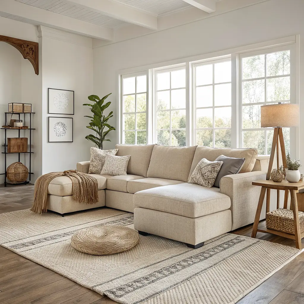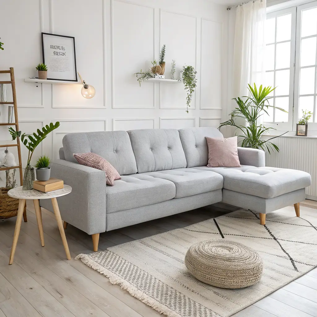 Start with a sectional in light gray or soft beige – nothing too stark. The Scandinavian aesthetic loves natural materials and soft textures, so think:
