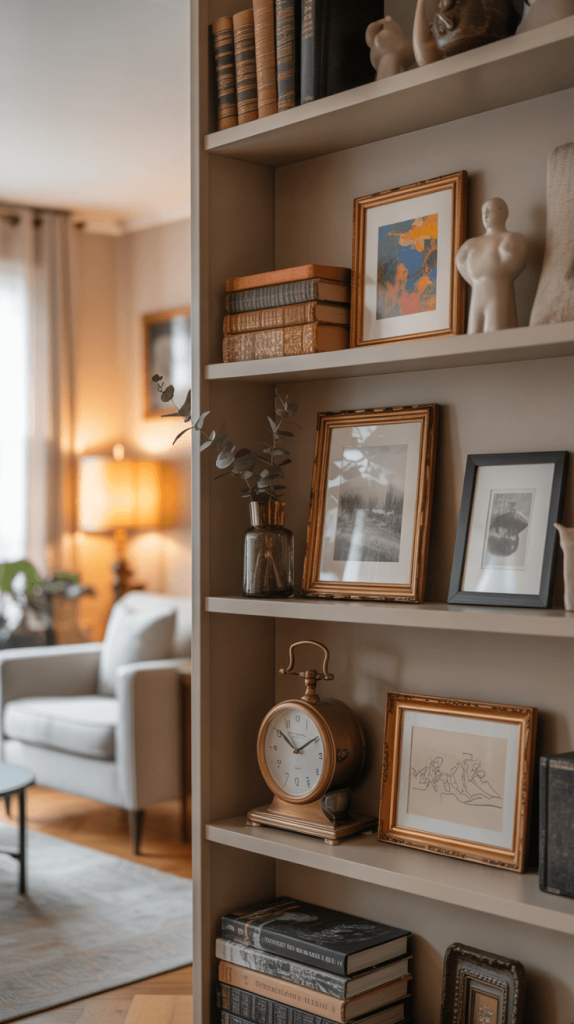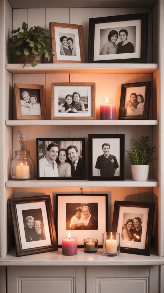 Incorporate Them into Vignettes: Don’t relegate all photos to one shelf. Sprinkle them throughout your shelving unit. Place a single framed photo next to a stack of books and a small object. It integrates your personal life into your decor seamlessly.