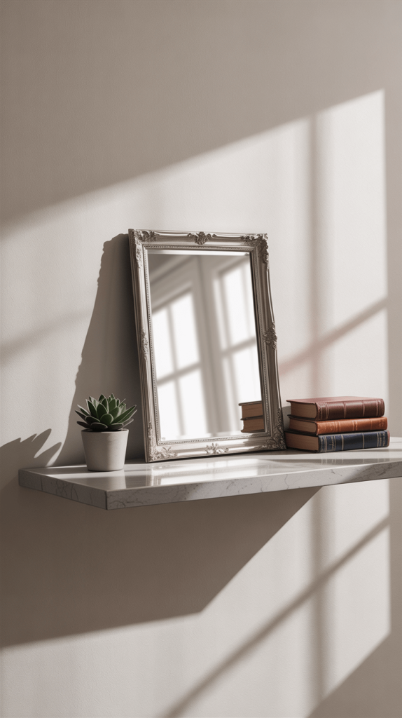 By strategically placing a mirror on your shelf, you can reflect light and the rest of the room, creating an illusion of more space and depth.