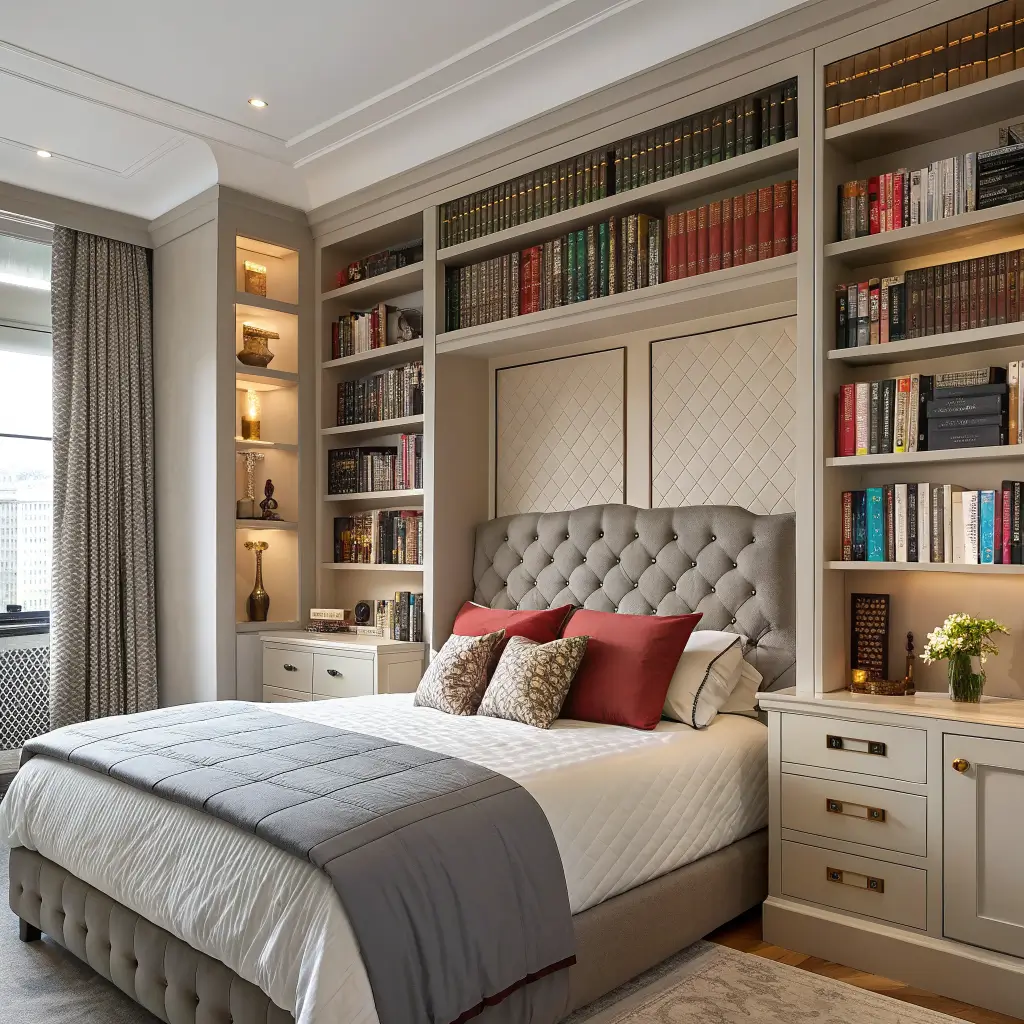 Ready to go big? Wall-to-wall built-in shelves above your bed create a stunning library wall that’ll make every book lover swoon. This option requires more commitment (and possibly a contractor), but the payoff transforms your entire bedroom.