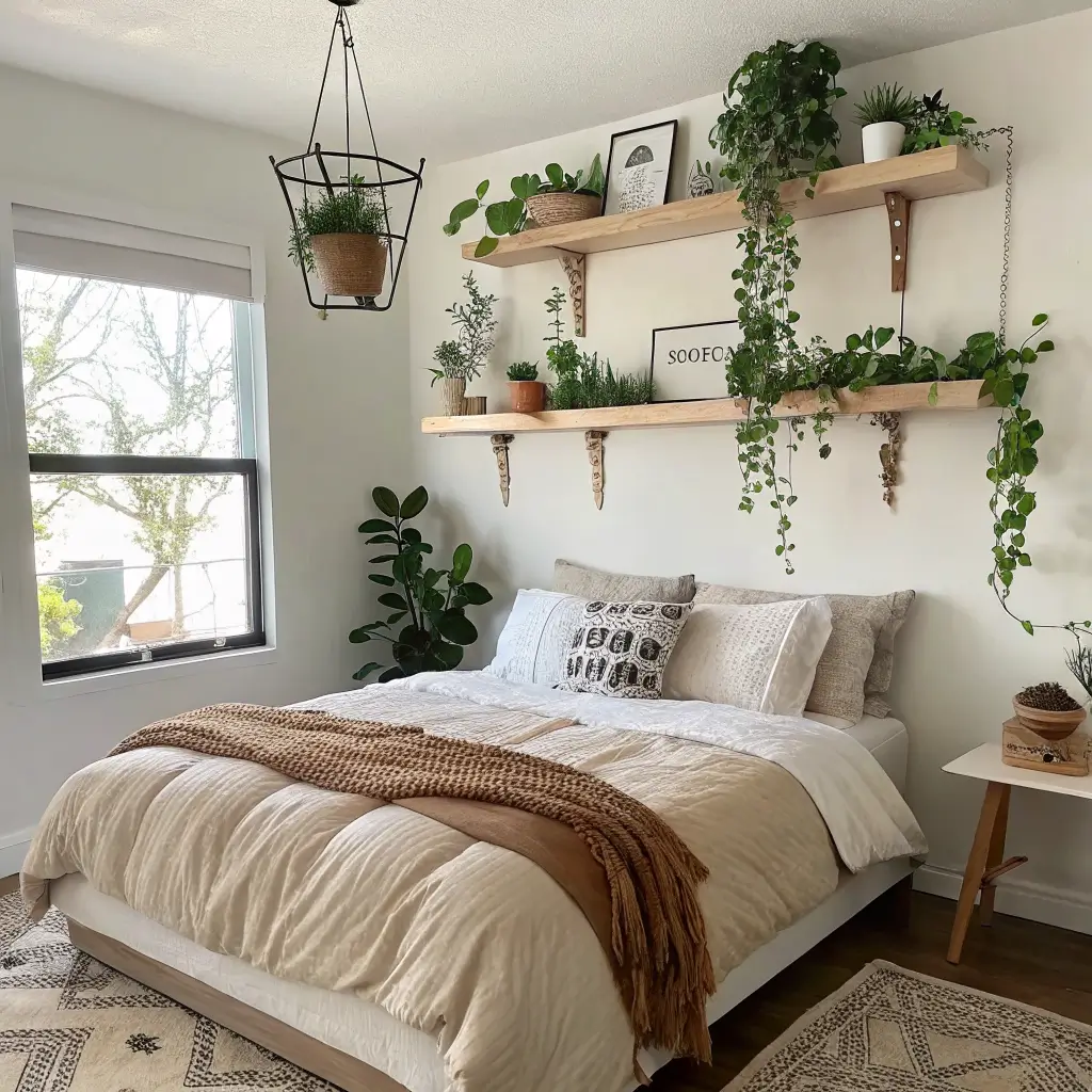 Want to bring the outdoors in? Layered floating shelves create the perfect vertical garden above your bed. This setup transforms your sleeping space into a botanical oasis that literally helps you breathe easier at night.