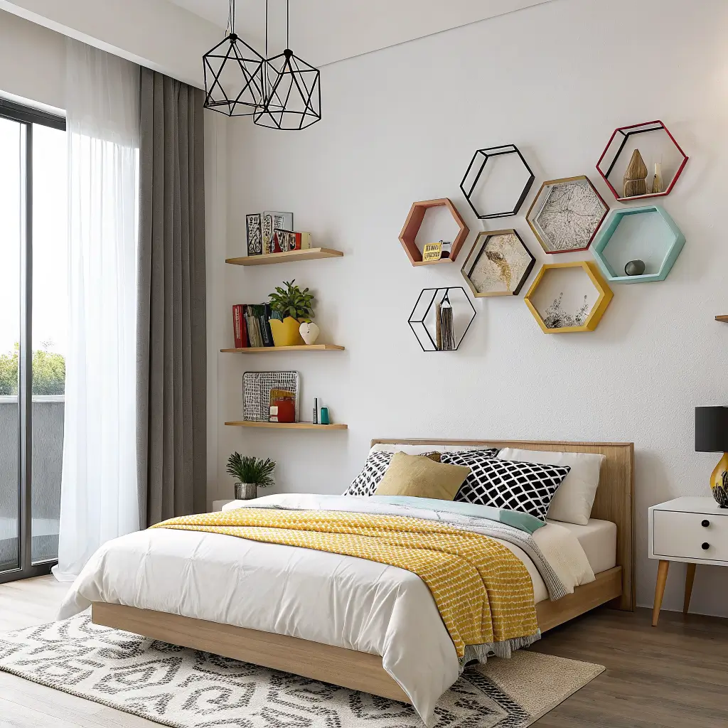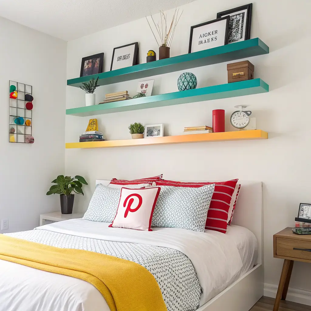 Ready to make a bold statement? Color-blocked floating shelves inject personality and energy into small bedrooms that might otherwise feel bland. This isn’t just storage – it’s functional art that reflects your style.