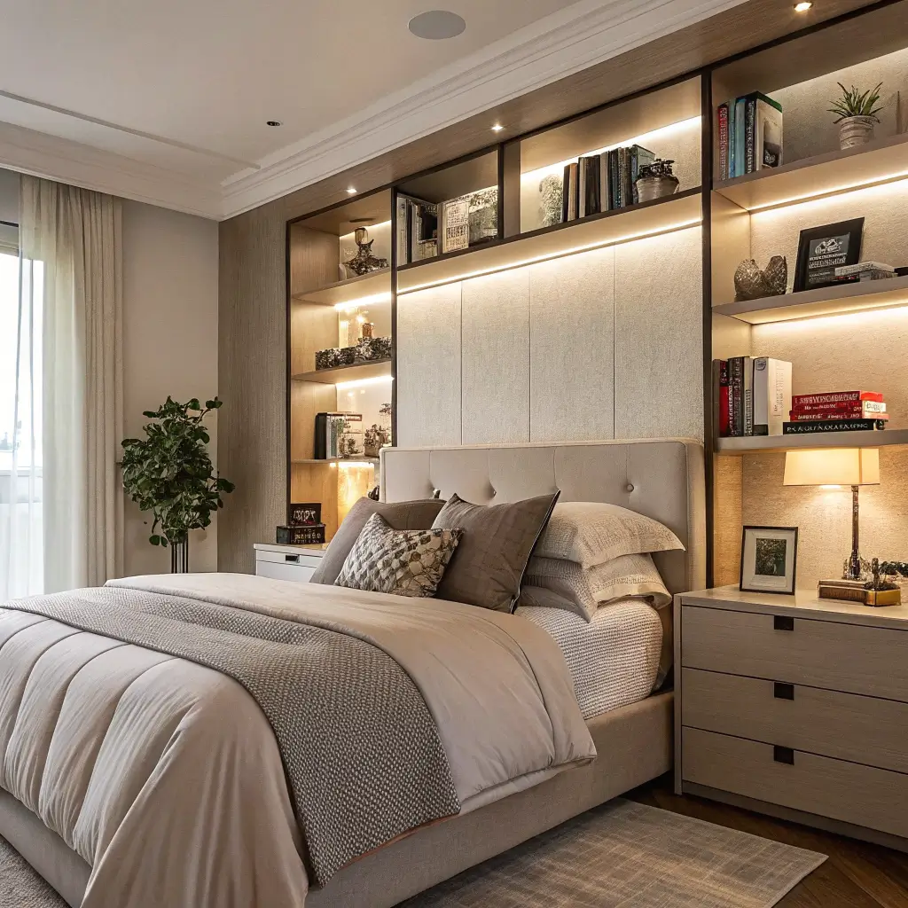 Why choose between a headboard and shelves when you can have both? Integrated headboard-shelf combos maximize vertical space while creating a custom built-in look without the custom price tag.
