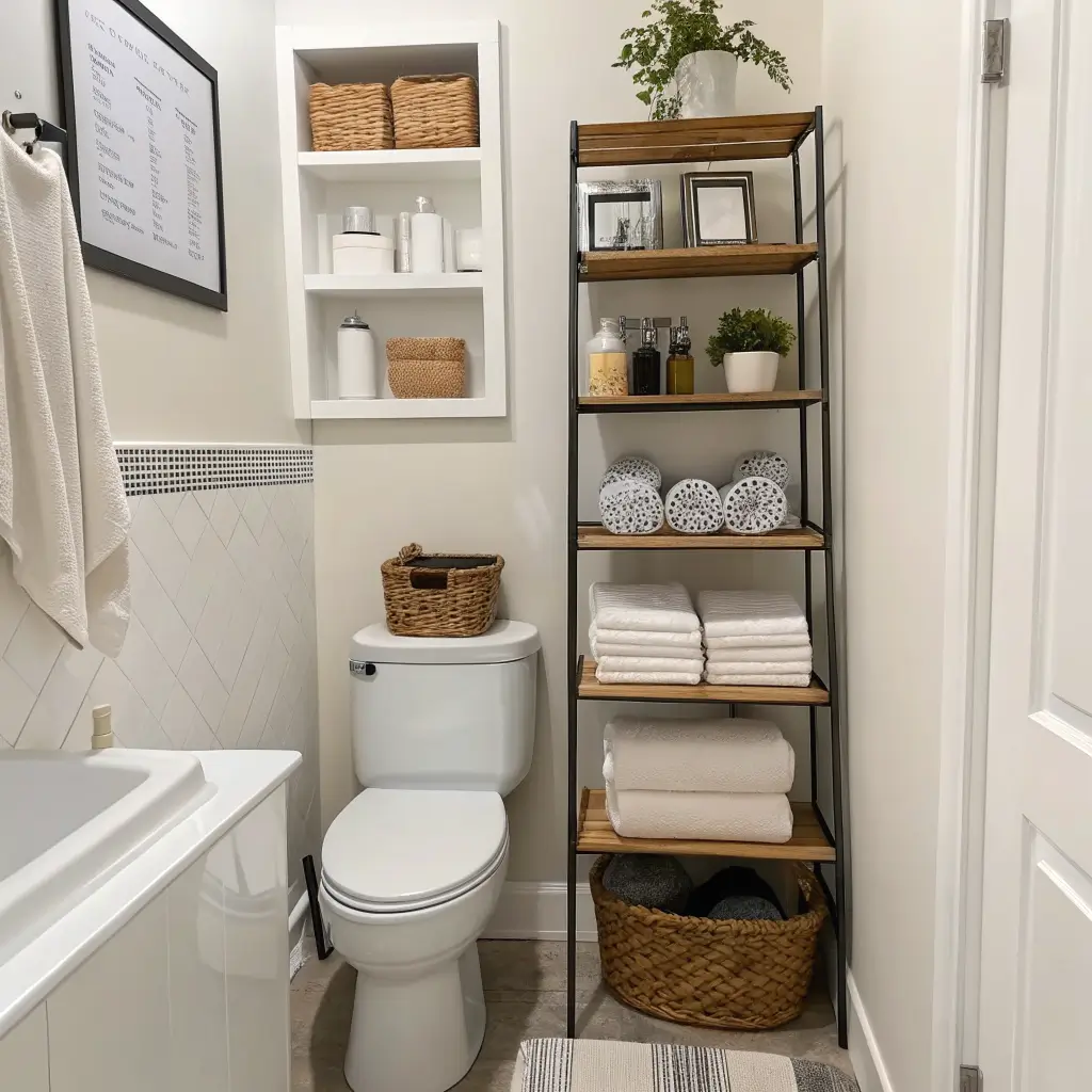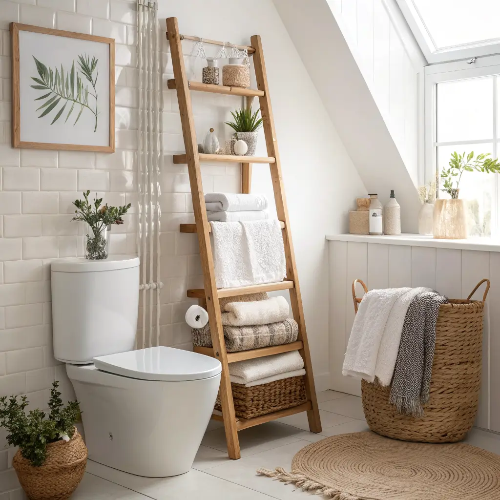 Consider your bathroom’s existing design, your storage needs, and honestly, your DIY comfort level. Some of these options require zero installation skills (looking at you, ladder shelves), while others might need power tools and a patient friend to help out.