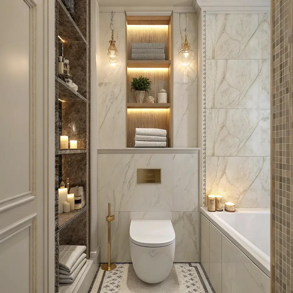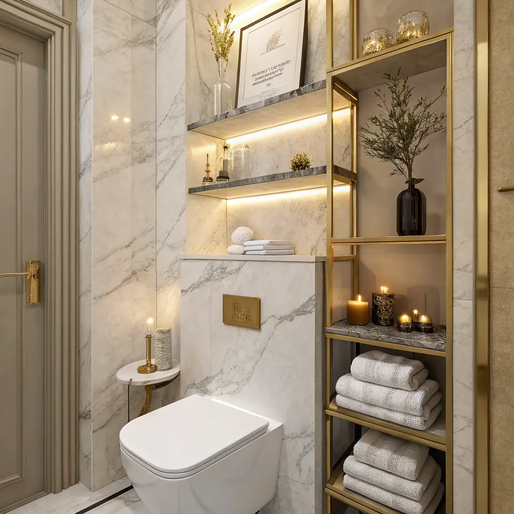 Marble shelves above the toilet create a focal point that distracts from the size of the room. The natural veining adds visual interest without overwhelming the space. I splurged on one marble shelf for my powder room, and it makes the entire room feel more luxurious.