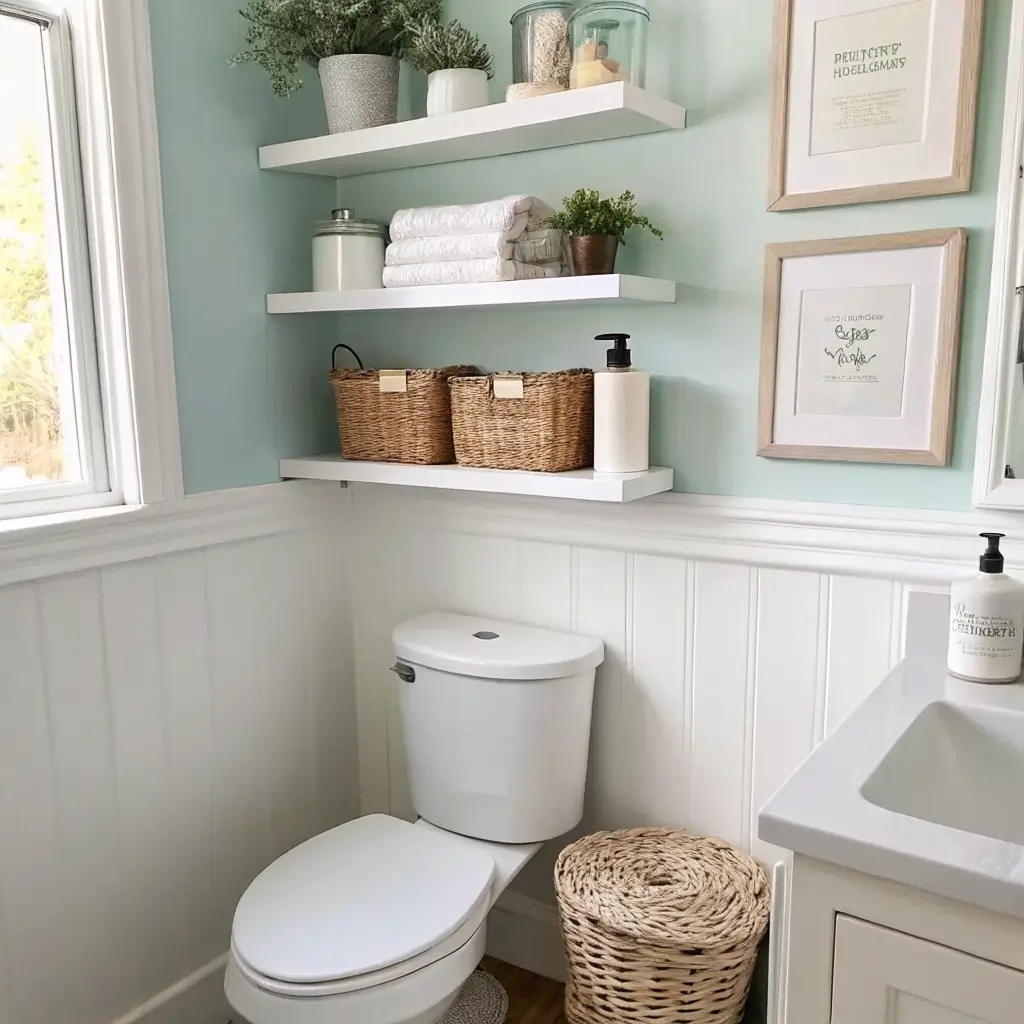 Who says tiny bathrooms can’t have that cozy farmhouse vibe? Rustic shelving above the toilet brings instant character to even the tiniest powder room. Think distressed wood, wrought iron brackets, and maybe some mason jar storage thrown in for good measure.