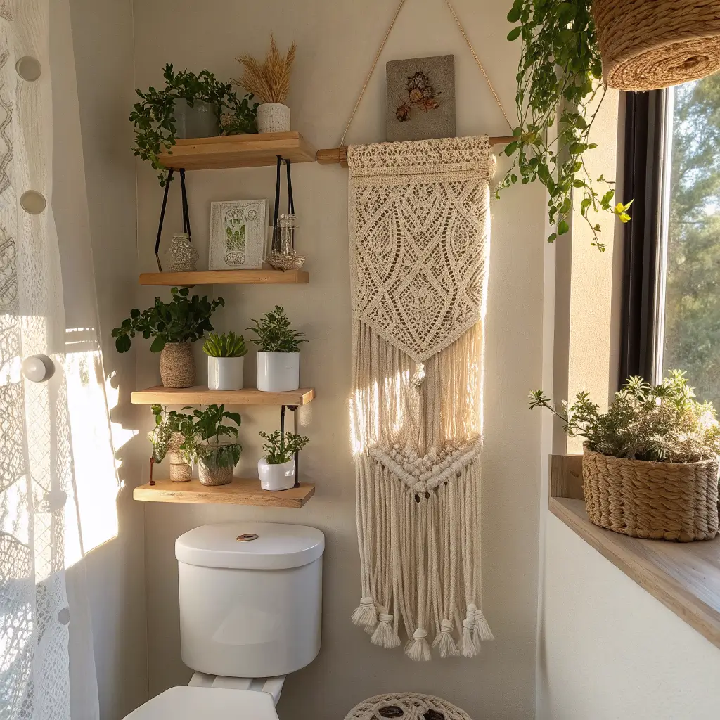 The key to nailing boho shelves above your toilet? Mix natural materials like wood, rattan, and jute. I’ve gone full boho in my guest bathroom with floating wood shelves, hanging plants, and vintage brass accents. Every guest comments on how “zen” it feels.