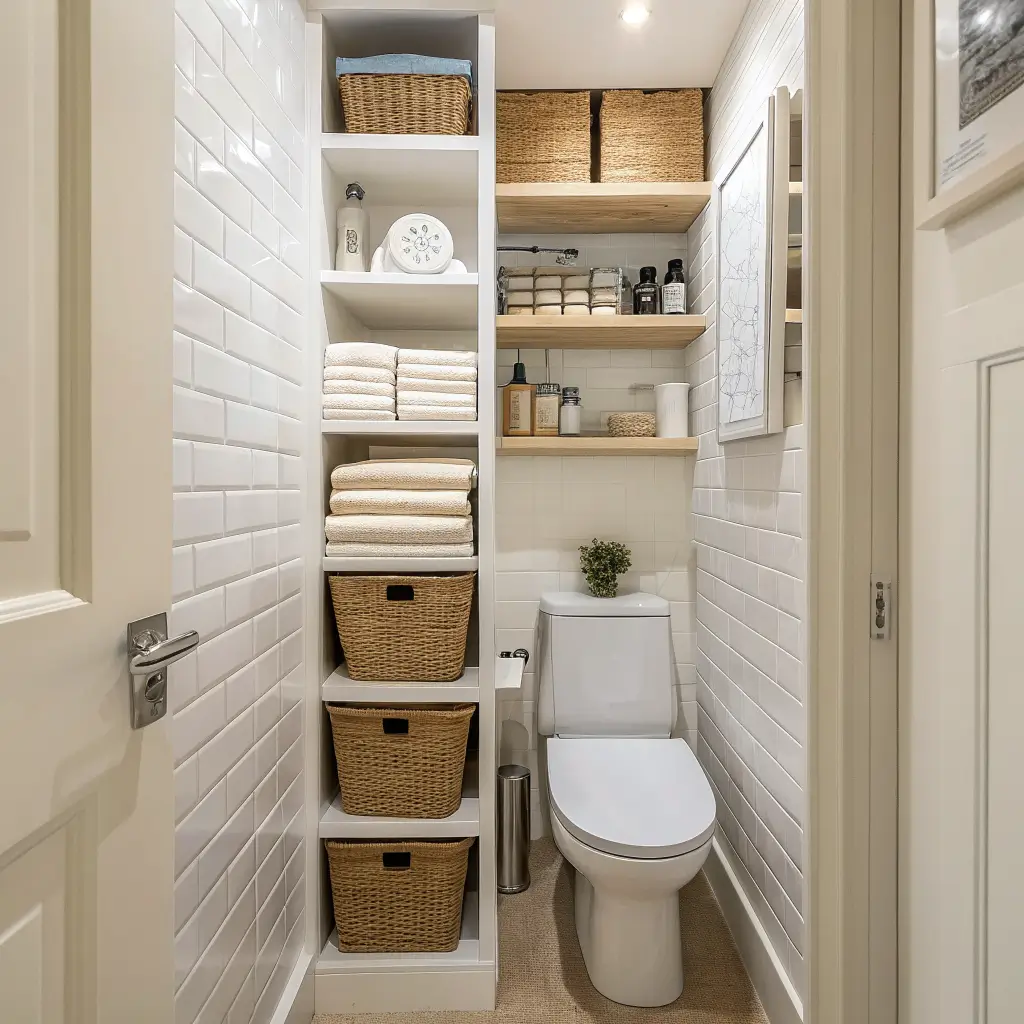 When you’re dealing with a truly tiny bathroom, you need to think vertically. Stacking narrow shelves from just above the toilet tank all the way to the ceiling maximizes every inch of wall space.