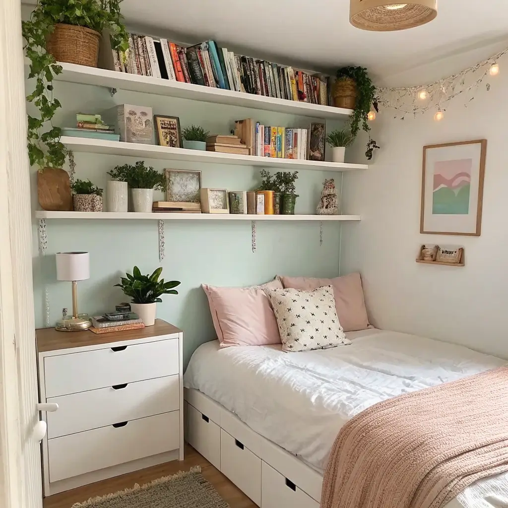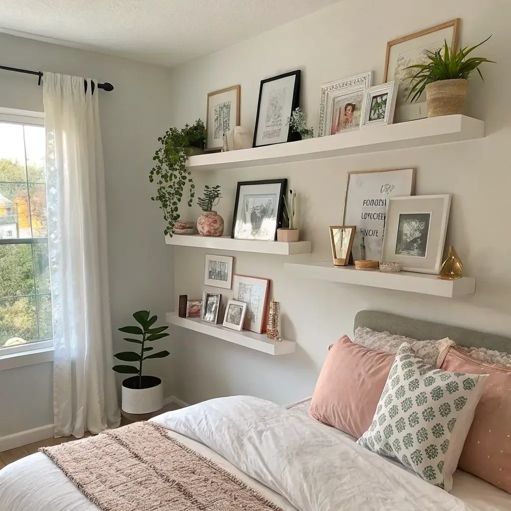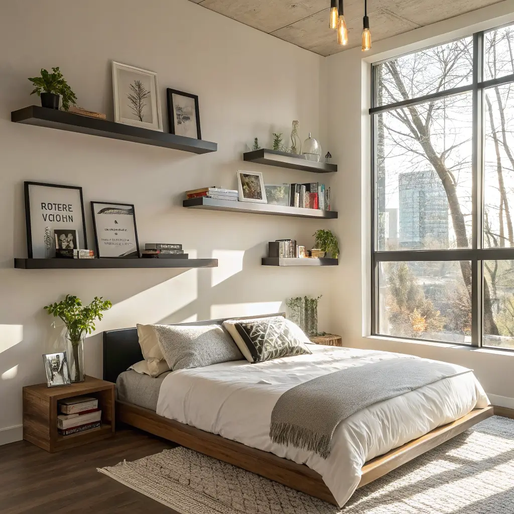 Small bedroom? I feel you. My first apartment bedroom was basically a glorified closet, but strategic floating shelves made it livable. The trick is going vertical and using every inch of wall space, including above doors and windows.