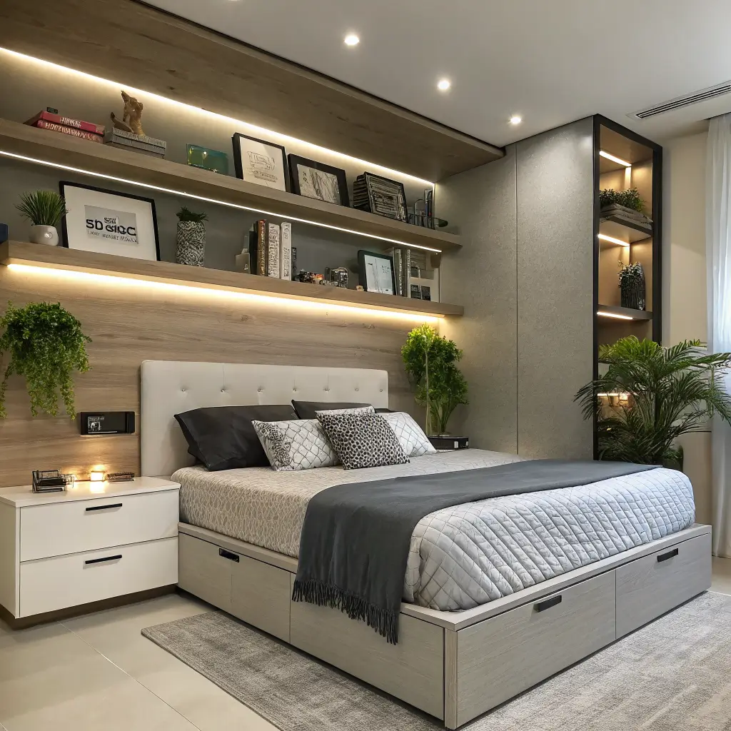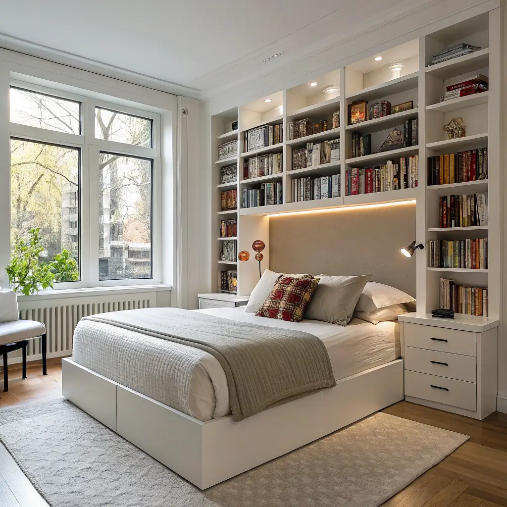 Start with one shelf idea that solves your biggest storage pain point. Need nightstand space? Floating nightstand shelf. Drowning in books? Built-in bookshelf headboard. Want to pretend you live in a boutique hotel? LED-lit shelves all the way.
