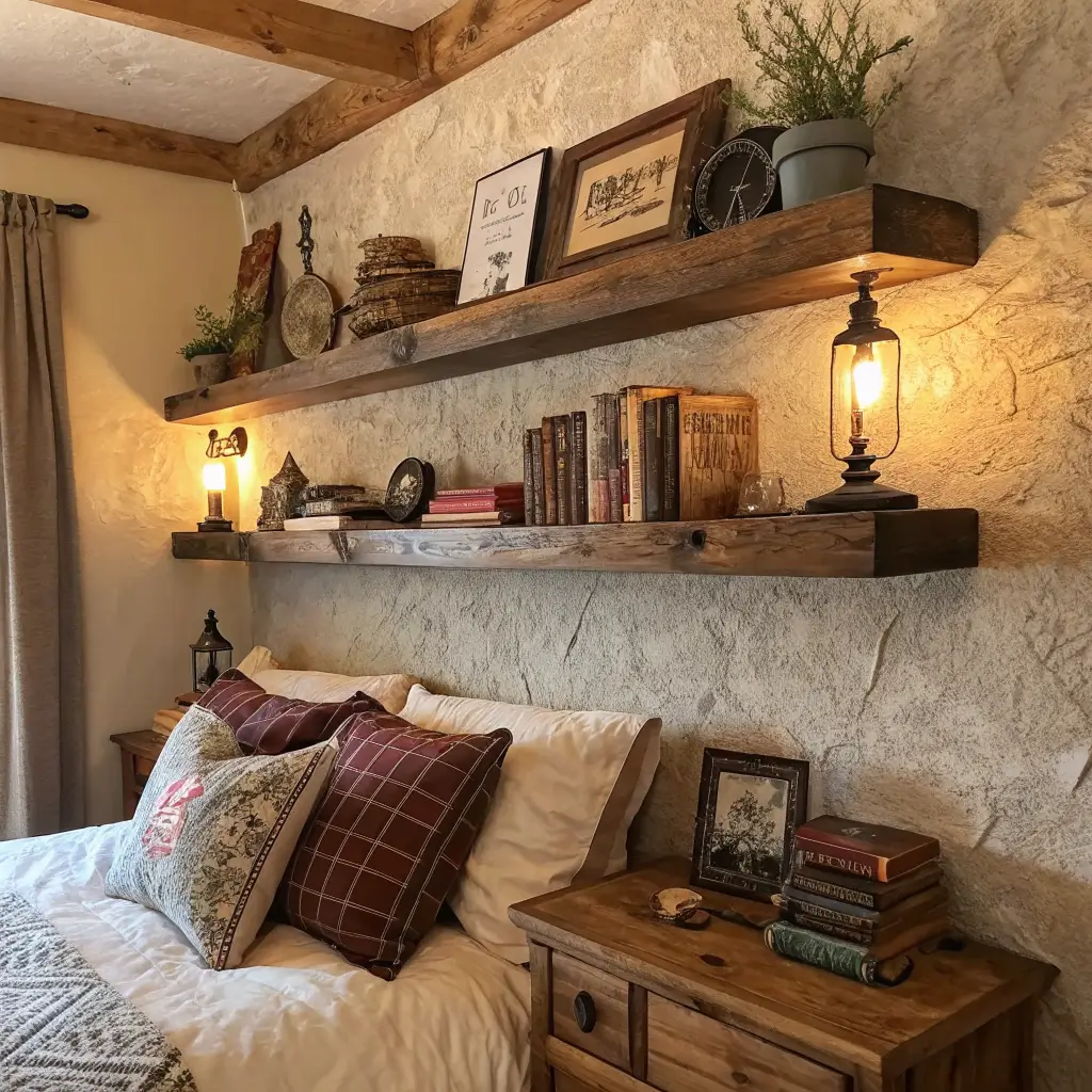 Nothing says “I have my life together” quite like rustic wooden floating shelves. I went with reclaimed barn wood for mine, and the character those old planks bring to my bedroom? Chef’s kiss. The natural grain patterns and imperfections add warmth that you just can’t get from mass-produced furniture.