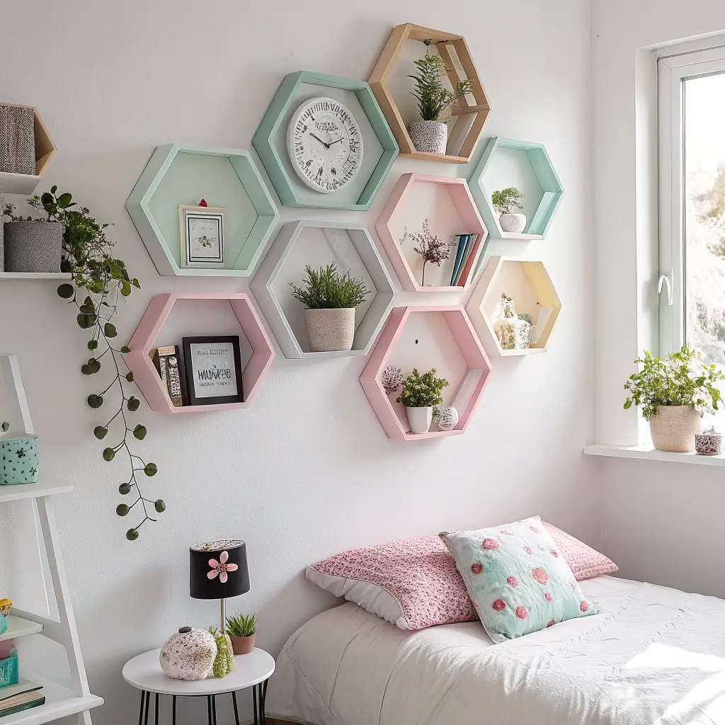 Want to make your wall look like modern art while adding storage? Enter geometric shelves. I’ve got a honeycomb pattern going on one wall, and every single person who enters my bedroom comments on it. Sometimes I pretend I designed it myself instead of copying a Pinterest board, but we all have our secrets.