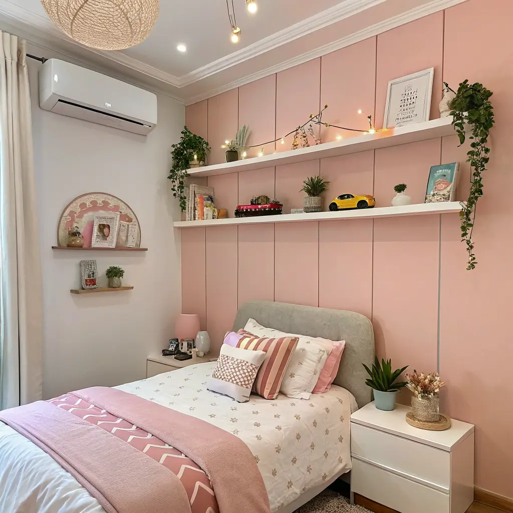 In tiny bedrooms, consistency is key. Stick to one shelf style and color throughout the room. Mix-and-match might work in larger spaces, but in small bedrooms, it creates visual chaos. Also, mirror-backed shelves can double the visual space – just saying.