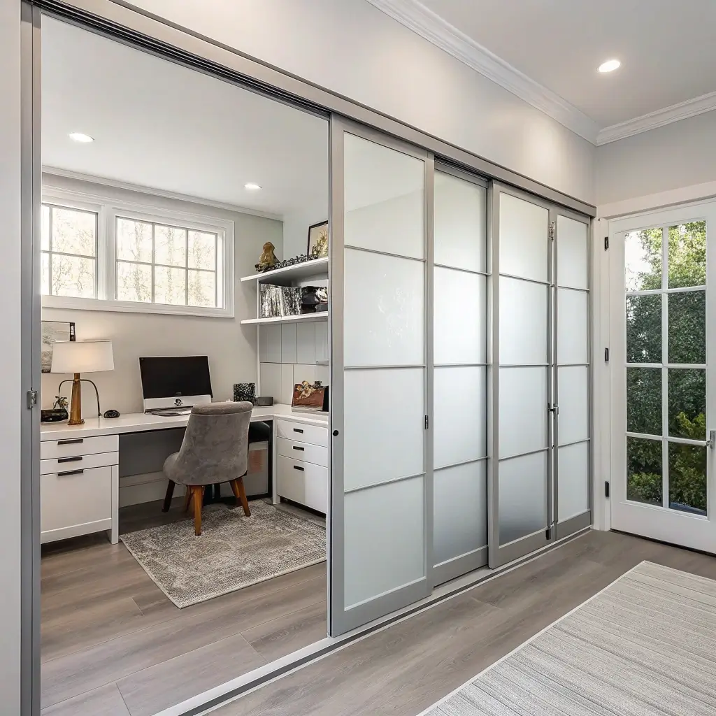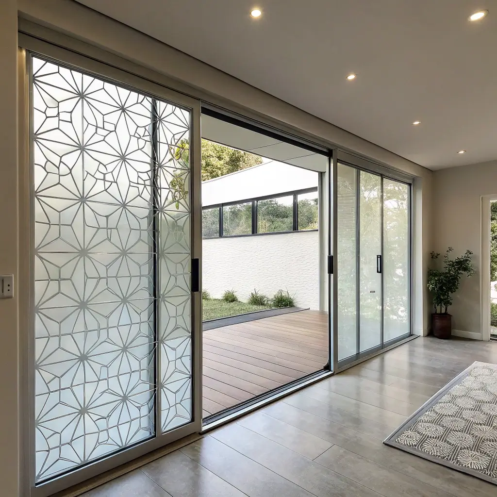 Frosted patterns on sliding doors offer privacy with personality. Unlike uniform frosting, patterns create visual interest while maintaining that light-filtering quality we love about translucent doors.