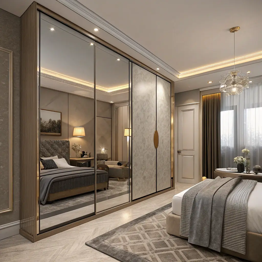 Mirrored sliding doors for wardrobes? Absolute game-changers for bedrooms. They make rooms look twice as large, eliminate the need for a separate full-length mirror, and hide your clothing chaos behind reflective elegance.