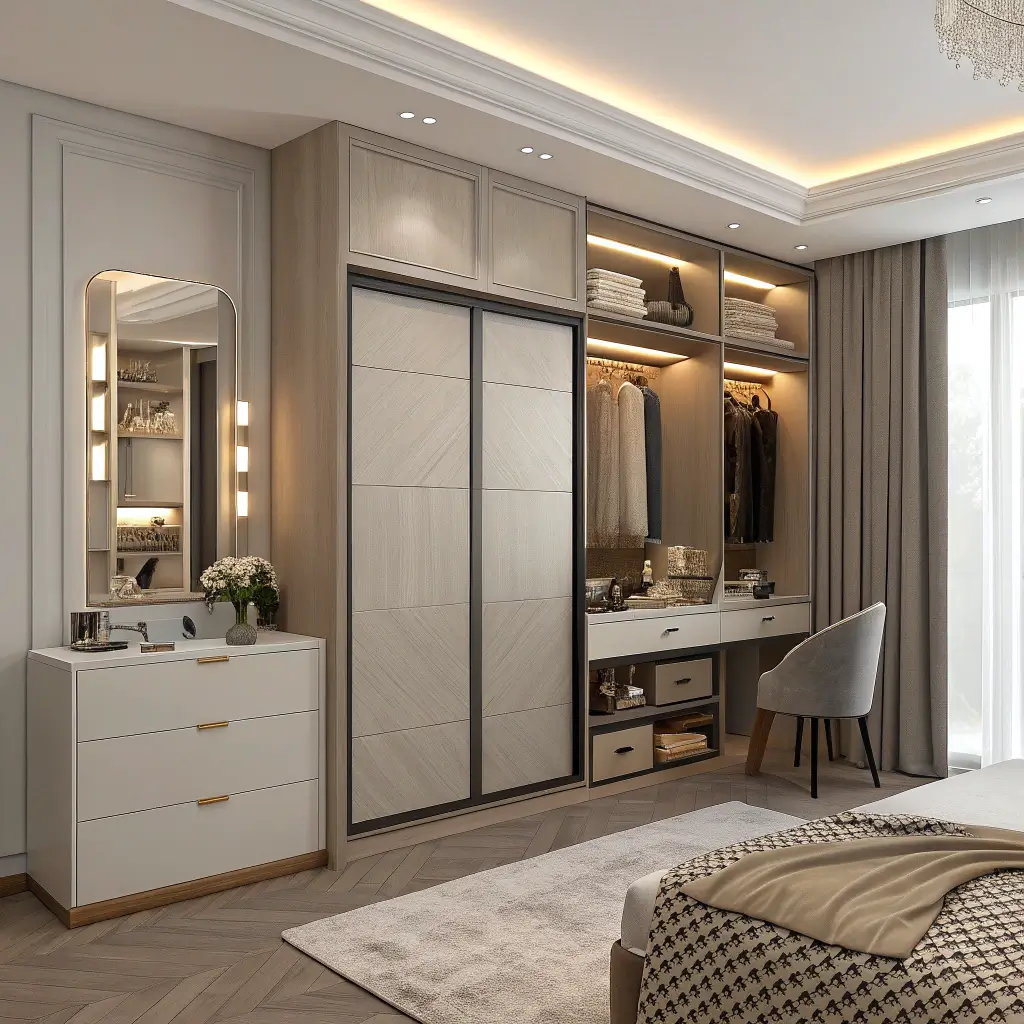 The dressing table section usually sits between two wardrobe units or incorporates into the door design itself. Some models feature lift-up mirrors that reveal cosmetic storage underneath.
