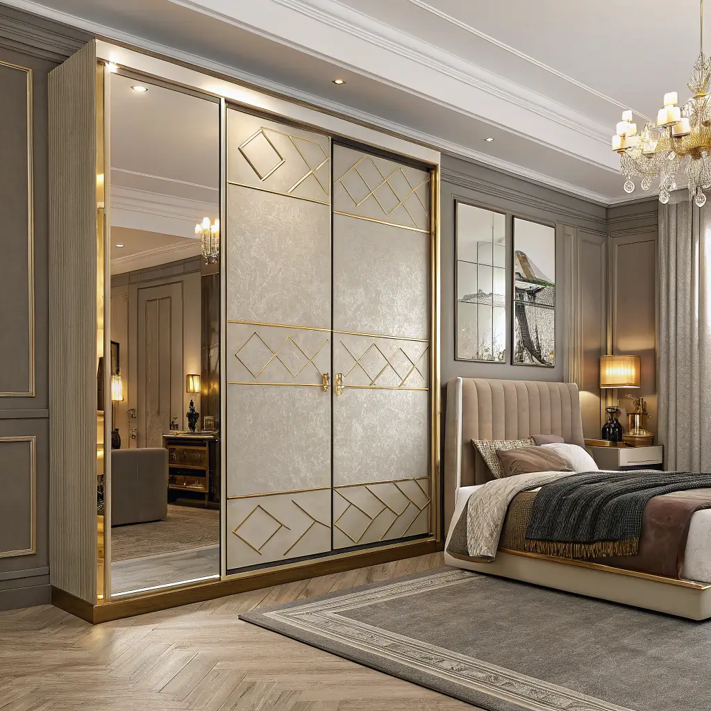 Ready to add some glamour? Luxury wardrobes with gold accents transform bedrooms into five-star hotel suites. The combination of premium materials and metallic details creates this incredible sense of opulence.