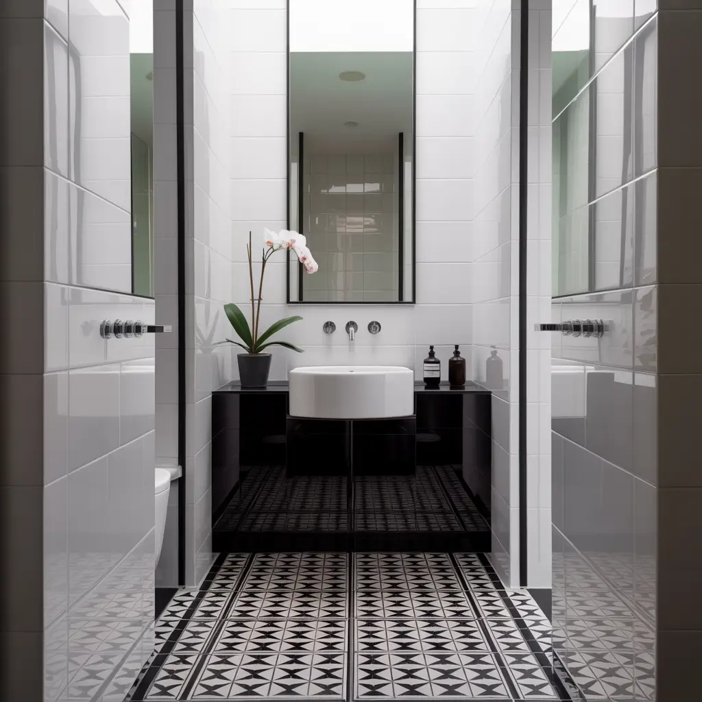 - Patterned floor tiles or a statement black vanity