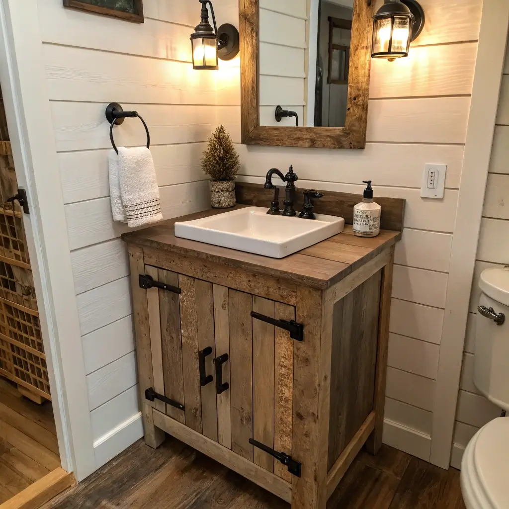 Y’all, the farmhouse trend isn’t going anywhere, and honestly? It works surprisingly well in small bathrooms. A mini farmhouse vanity brings that cozy, lived-in feel without the bulk of a full country-style cabinet.