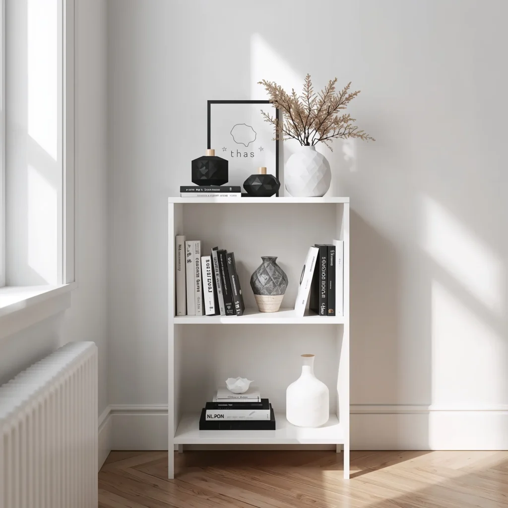 Sometimes less really is more. A monochrome shelf setup creates instant sophistication without trying too hard. I discovered this approach when I moved into my studio apartment and needed everything to feel cohesive in a tiny space.