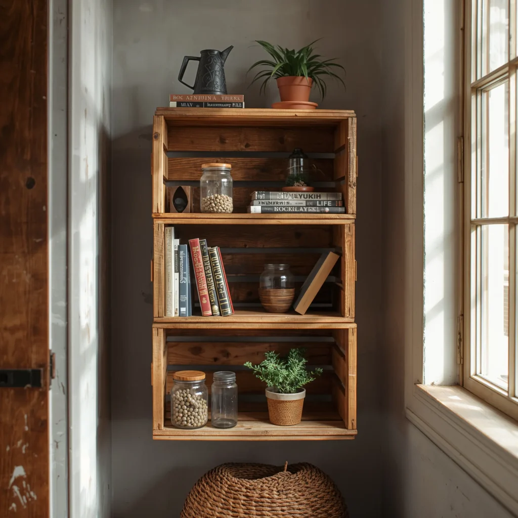Who says your bookshelf needs to be an actual bookshelf? Wooden crates transformed my awkward corner into the coziest reading nook, and people always ask where I bought my “custom shelving.” The answer? The craft store clearance section and some wood stain.