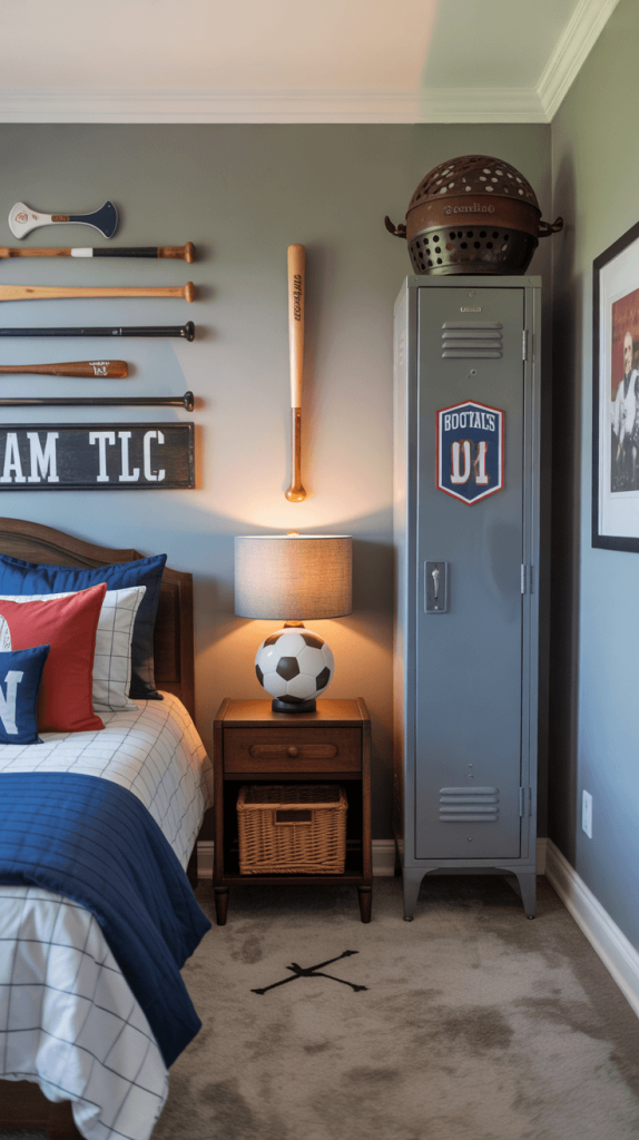 - Themed Storage: A metal locker is amazing for sports-themed rooms. It provides awesome, industrial-style storage for clothes, toys, or sports gear and totally sells the athletic vibe.