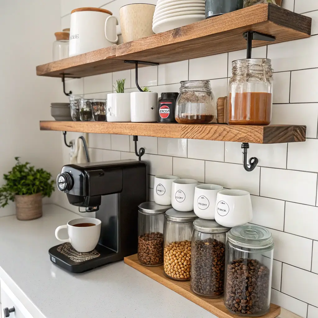 What really sells this setup is smart storage. I use airtight glass jars for coffee beans â€“ they look sleek and keep everything fresh. Mount a small hook underneath your shelf for mugs, and suddenly you’ve freed up even more space.
