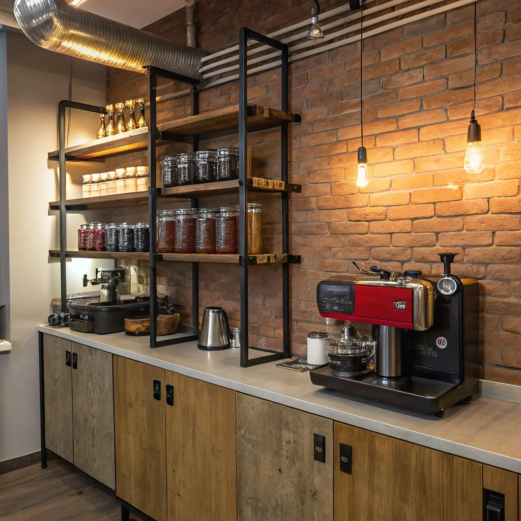 The industrial pipe trend might be overdone, but you know what? It works incredibly well for coffee bars. The pipes provide sturdy support for heavy equipment, and the aesthetic fits everything from modern lofts to traditional kitchens trying to add edge.