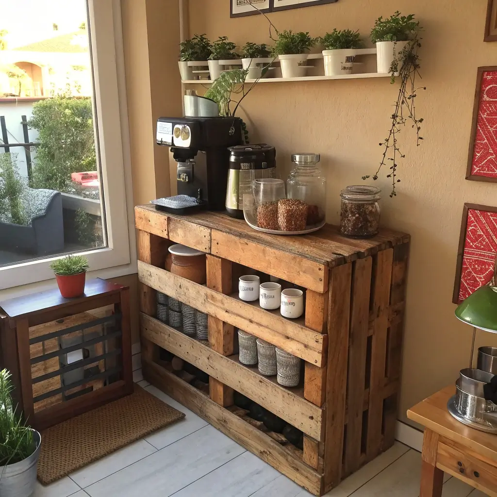 For styling, embrace the rustic vibe but add some polish. I paired my pallet shelves with modern coffee equipment and sleek storage jars. The contrast between rough wood and refined accessories creates visual interest without looking too “crafty.”
