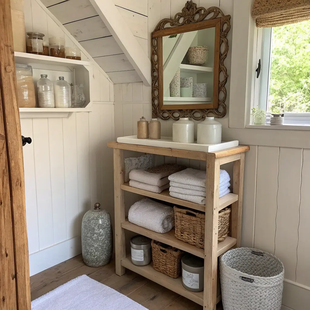 Storage in a small bathroom can be a nightmare. Where do you put all those towels, toiletries, and random hair products that somehow multiply overnight? The vintage cottage approach actually solves this problem beautifully because antique furniture pieces often have built-in storage that modern pieces lack.
