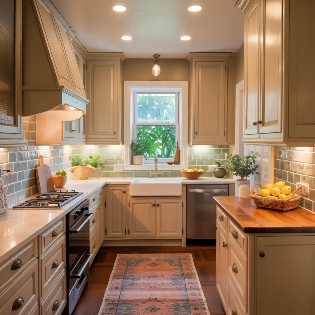 For lighting, forget those harsh overhead fluorescents that make everyone look like they haven’t slept in weeks. Install dimmers on everything (seriously, best $20 you’ll ever spend), add under-cabinet LED strips, and maybe hang a small pendant or two over your workspace. The goal is to create pools of warm light that make your kitchen feel like a cozy cave rather than an operating room.