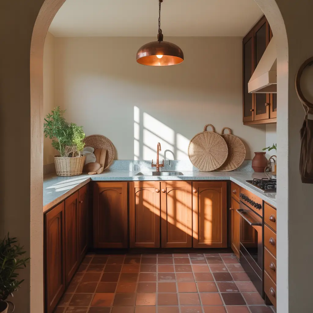 You don’t need to go full southwestern to nail this look. Try one terracotta accent wall, or add ochre-colored textiles and warm brass fixtures. The earthy palette pairs beautifully with natural wood and creates this enveloping warmth that makes you want to slow down and actually enjoy cooking.