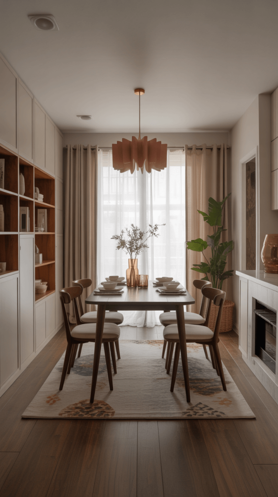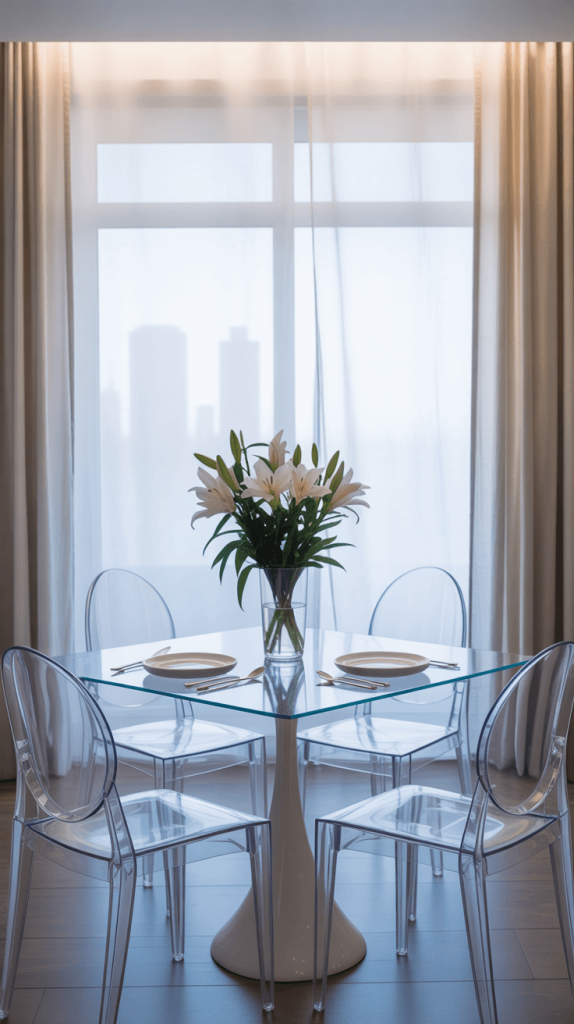 Consider a clear acrylic dining table or chairs to add a touch of sophistication while keeping the room feeling spacious.