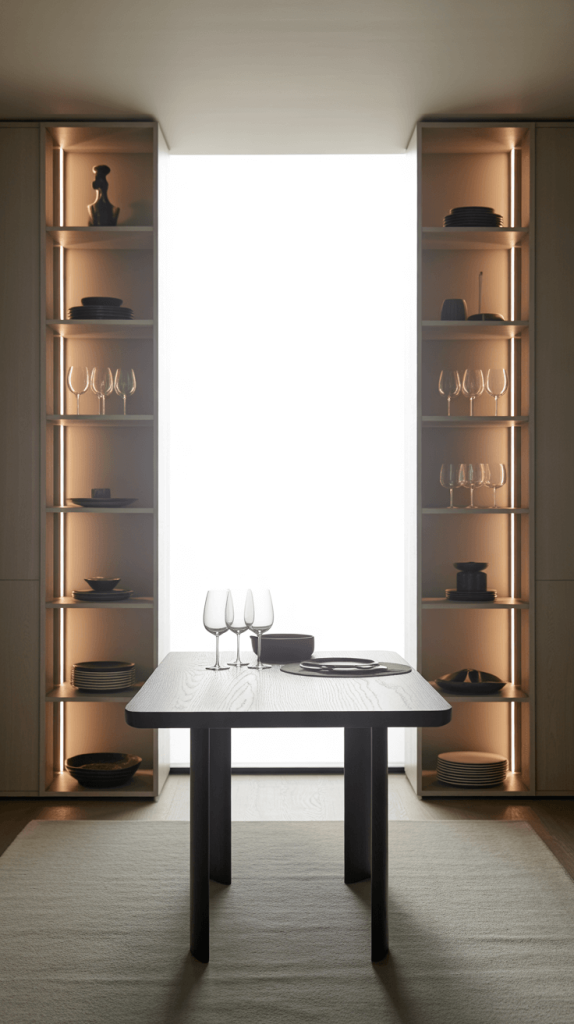 Take advantage of your dining roomโs height by adding vertical storage solutions.