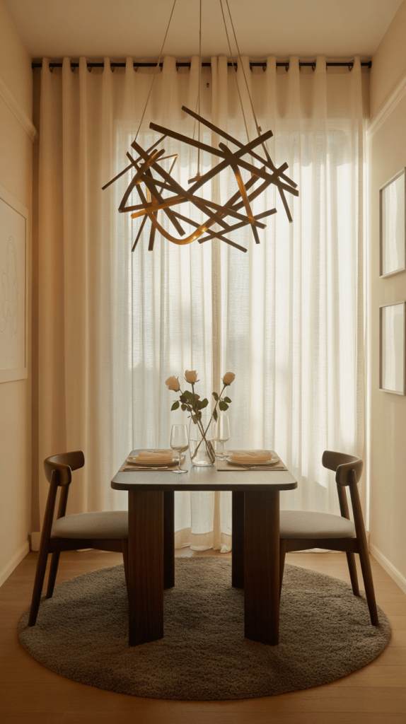 Avoid heavy drapes that can block out light and make the space feel smaller. You can also position your dining table closer to the window to take full advantage of the light.