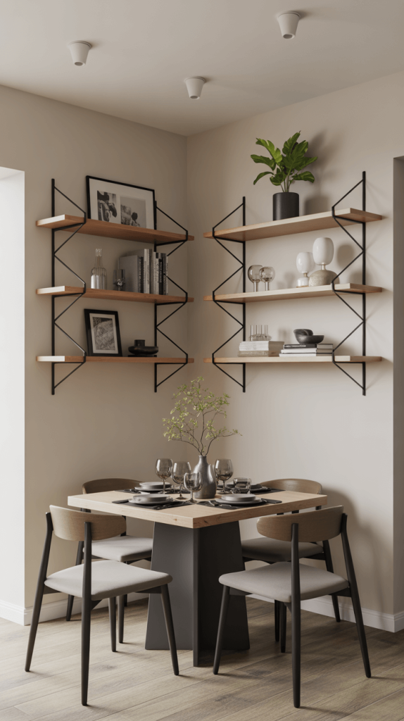 Floating shelves on the walls offer a practical way to store and display items without taking up any floor space.