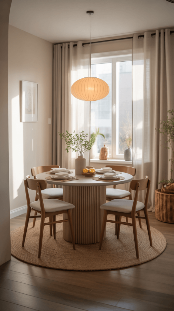 A round dining table is a great choice for small spaces because it offers a softer, more fluid flow compared to traditional rectangular tables.