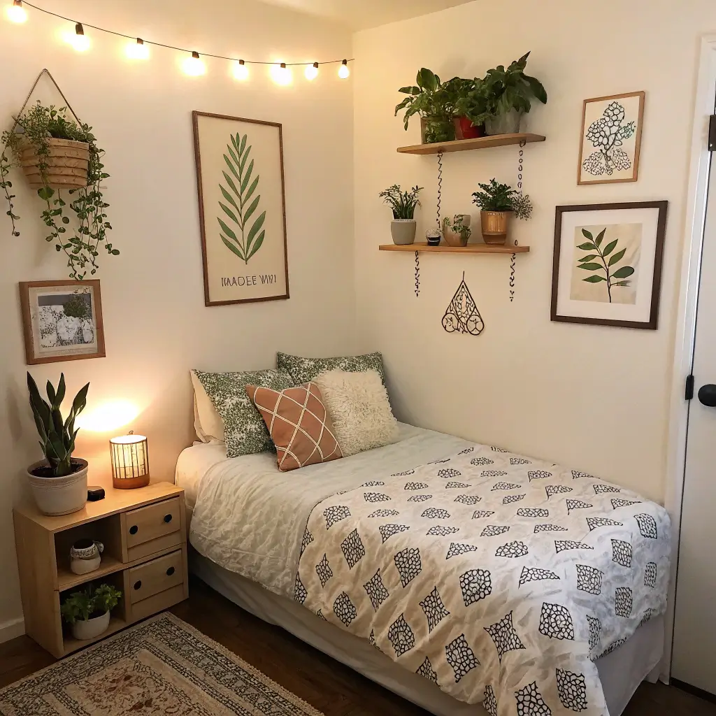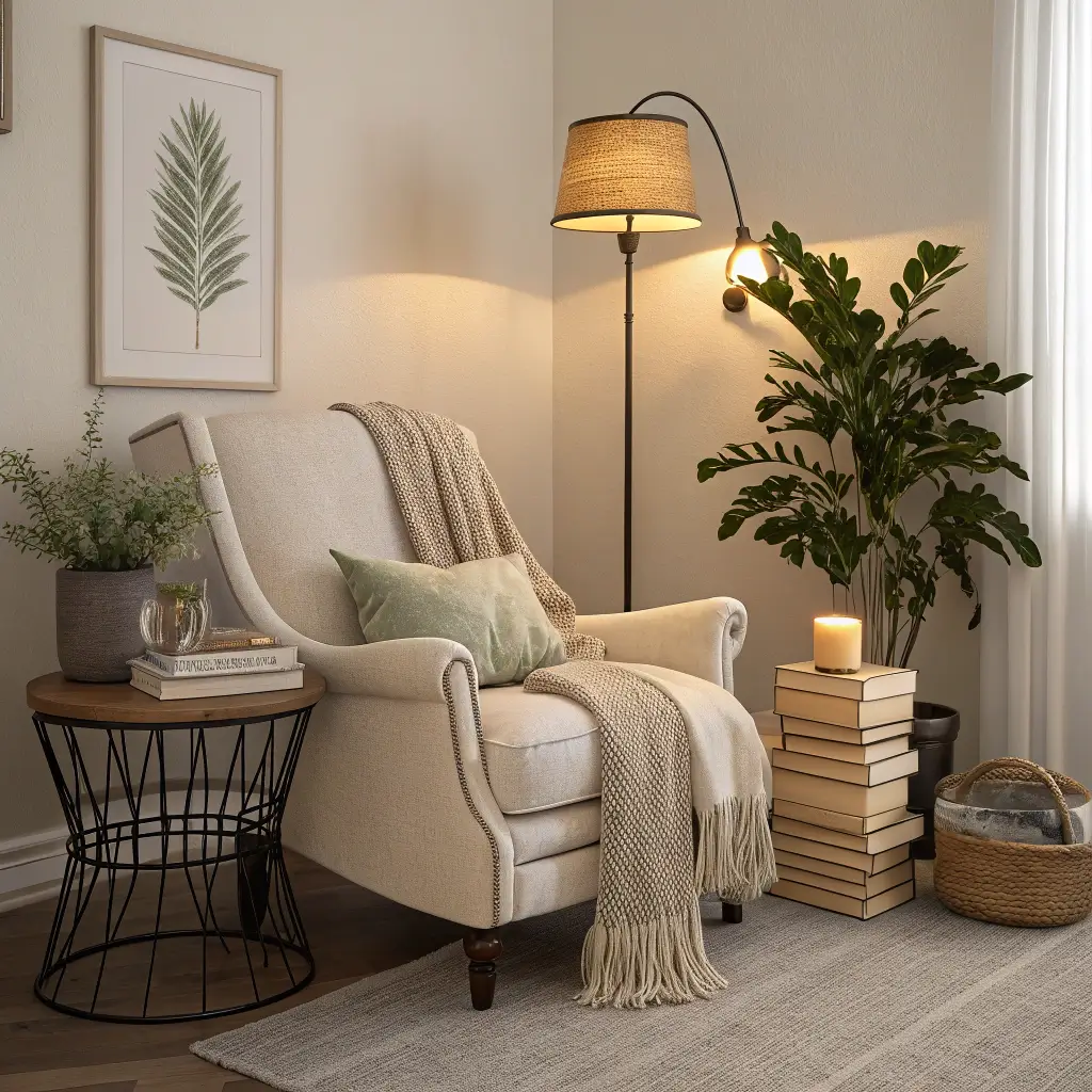 Even the tiniest room can accommodate a cozy corner. Float a corner shelf for books, add a small pouf or floor cushion, and hang a pendant light. Suddenly, you’ve created a destination within the room.