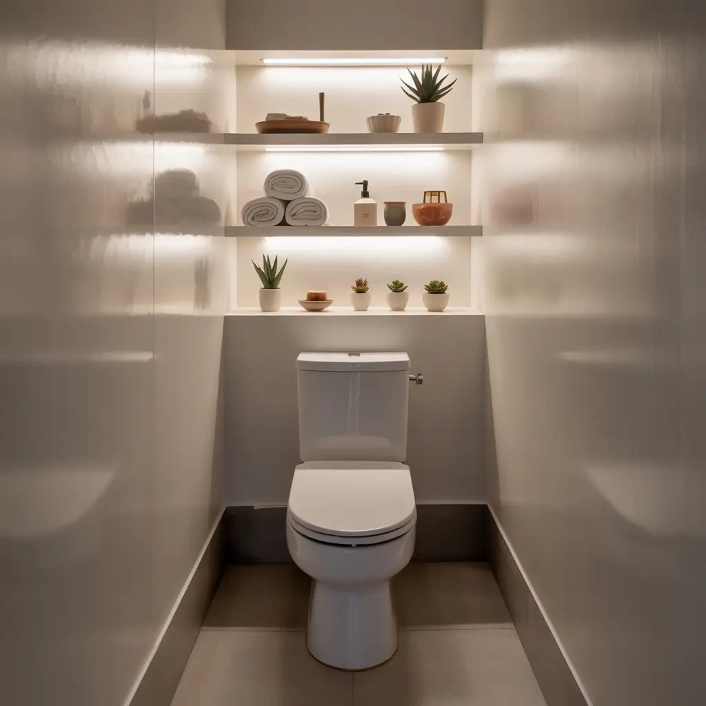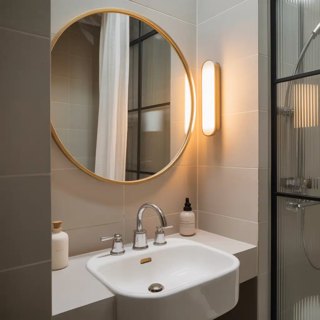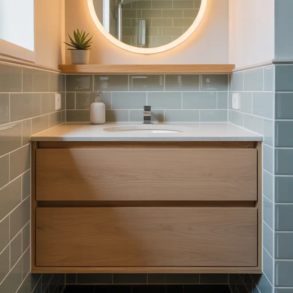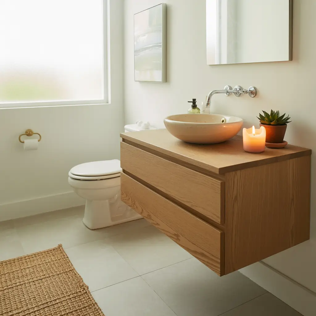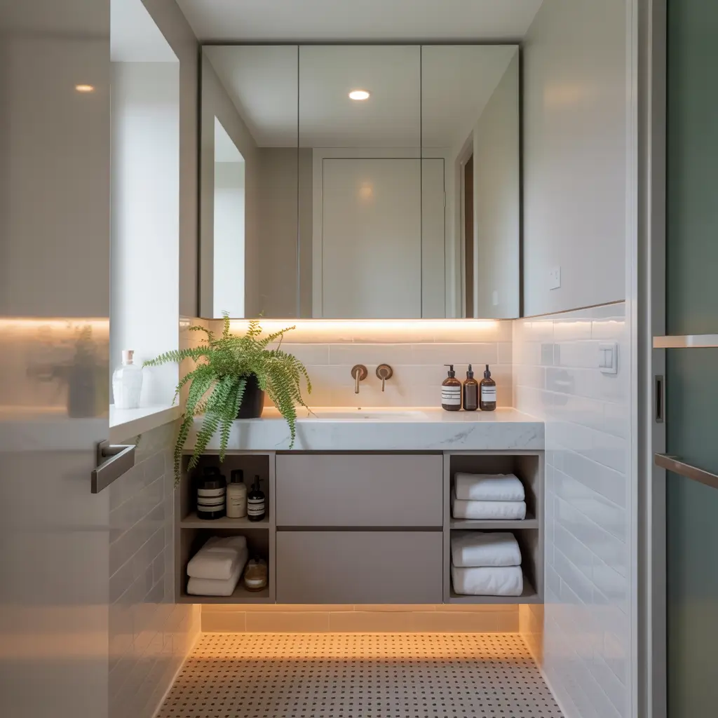 I replaced my chunky overhead fixture with recessed lights and added LED strips under the floating shelves. The layered lighting makes the space feel twice as big, and the ambiance? Chef’s kiss. Plus, dimmer switches let you adjust the mood from “applying makeup” bright to “relaxing bath” soft.