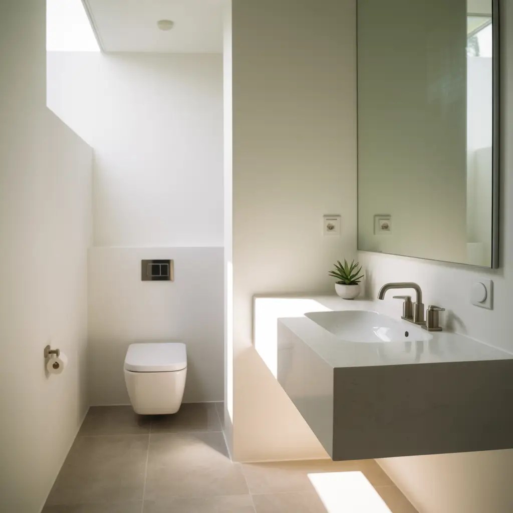 A minimalist half bath typically includes just three elements: toilet, sink, and mirror. That’s it. No decorative shelves, no extra furniture, no cluttered countertops. The result? A space that feels calm, clean, and surprisingly spacious.