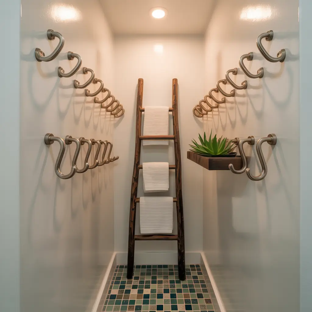 My personal favorite is a swing-arm towel holder mounted beside the sink. It folds flat against the wall when not in use. Genius! I also love over-the-toilet ladder racks that lean against the wall – they hold towels plus provide shelving.