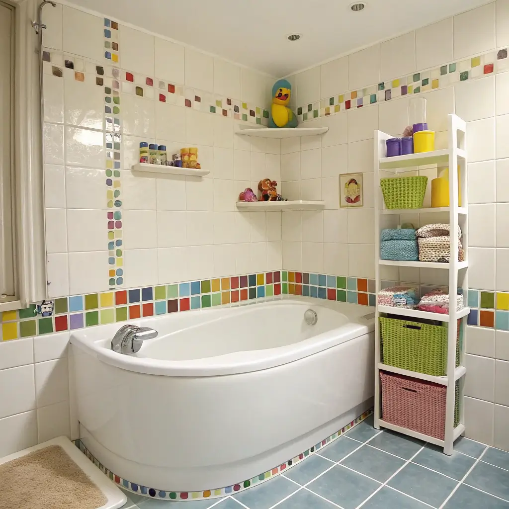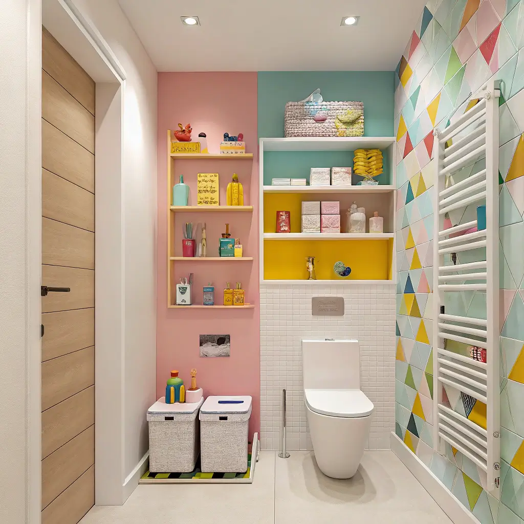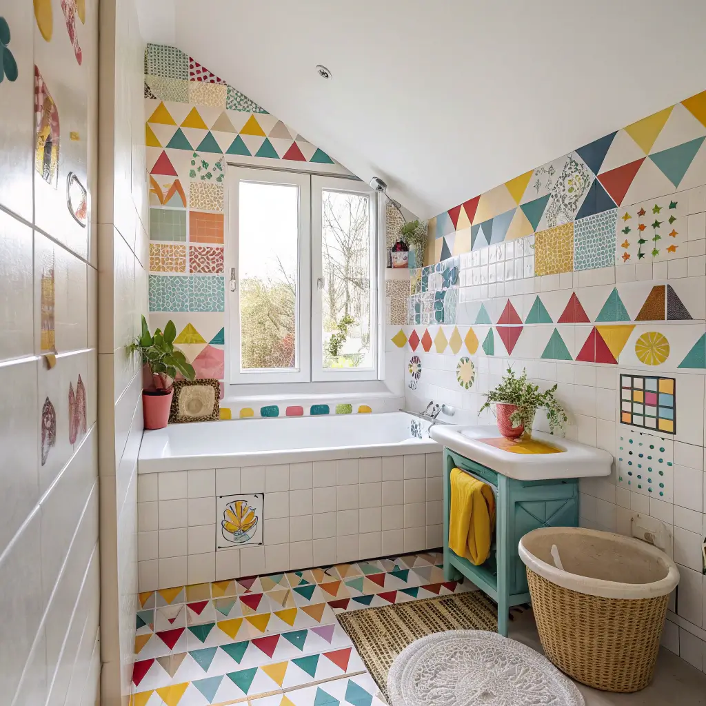 Tiles set the entire mood of a bathroom, and in small spaces, they’re your secret weapon for making the room feel larger and more exciting. Forget those boring white squares – we’re going bold! Geometric patterns, colorful mosaics, and playful designs transform tiny bathrooms into spaces kids actually enjoy.