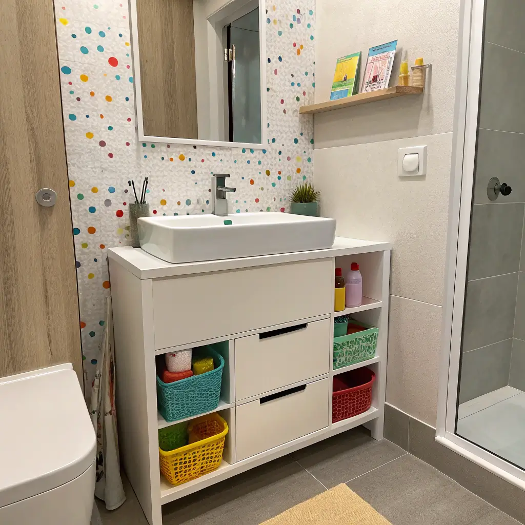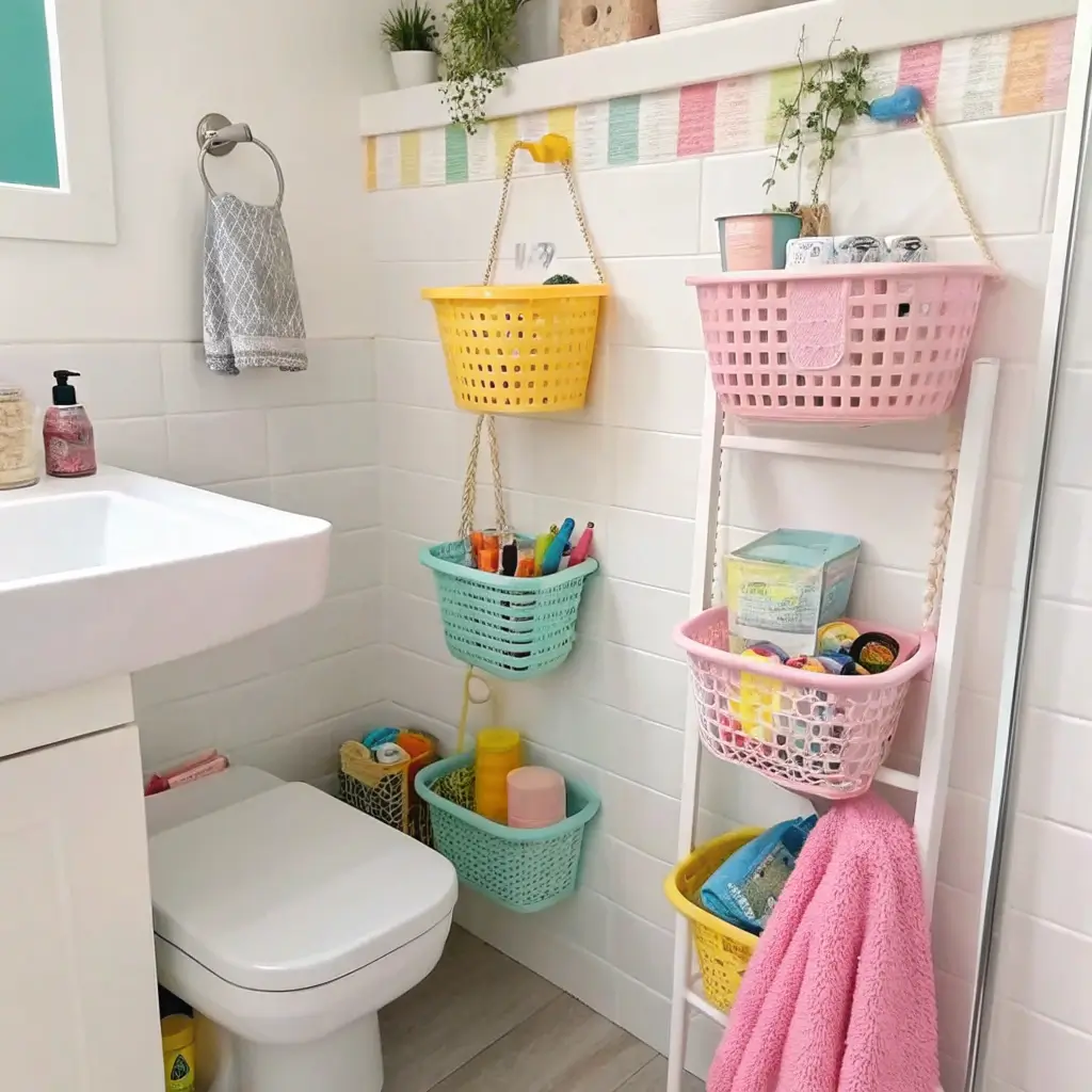I’m talking rainbow-colored bins, animal-shaped hooks, and magnetic strips that hold toothbrush holders. Mount everything at kid height (obviously), but here’s a pro tip: install some storage higher up too. That’s where you stash the stuff they shouldn’t reach – medications, cleaning supplies, or that fancy shampoo you’re saving.