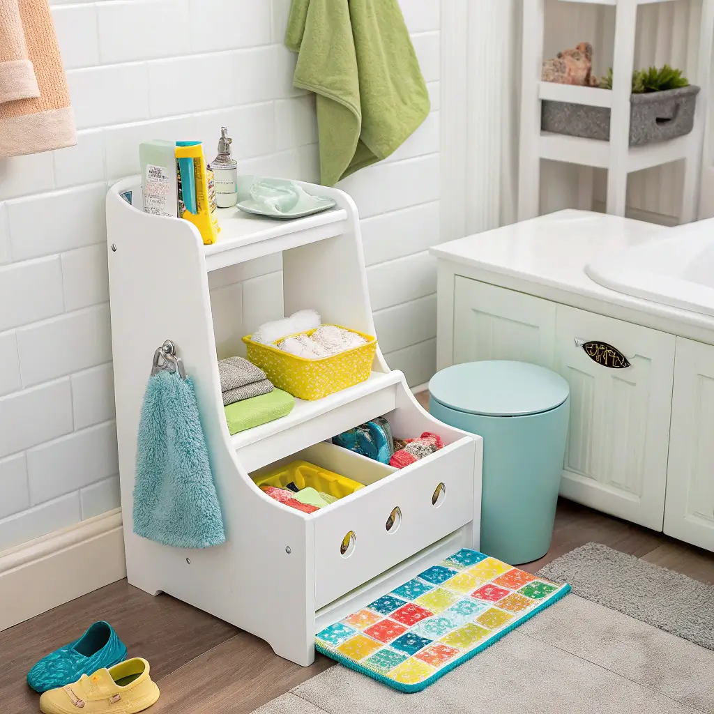 Regular step stools waste space when not in use, but multi-functional designs earn their keep 24/7. Storage step stools hide toys, towels, or toiletries inside while providing that needed boost to reach the sink.