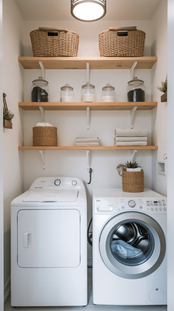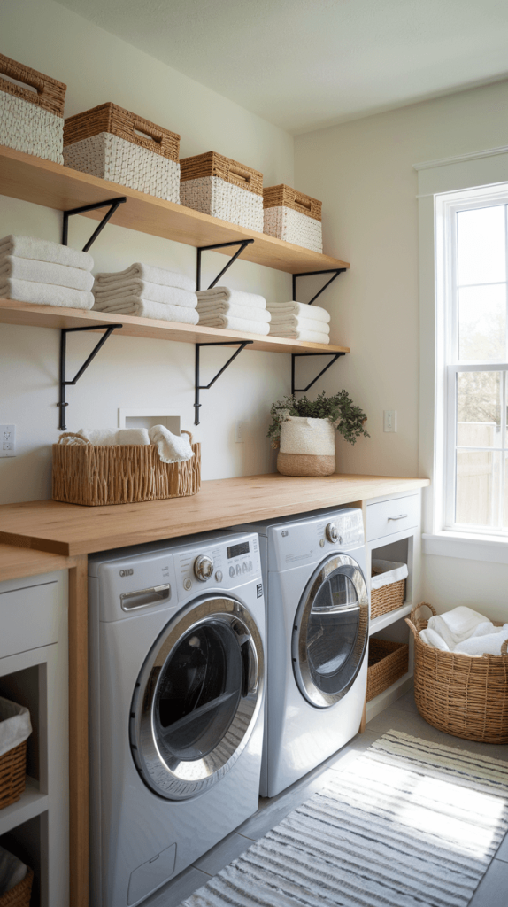 Let’s kick things off with arguably the MVP of small space organization: the floating shelf. Why are they so perfect for laundry rooms? They utilize dead air space without eating into your precious floor real estate.