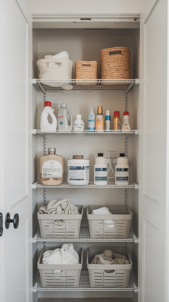 Woven baskets add texture and warmth, while sleek metal or plastic bins give a more modern, utility-focused vibe. Either way, you get the easy access of open shelving with the neat-and-tidy feel of closed storage. It’s the best of both worlds.