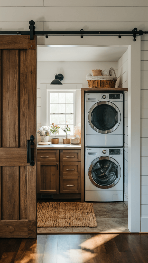 This one is for those whose laundry room has an actual door. A standard swinging door can eat up a ton of valuable floor space every time you open it. Replacing it with a sliding barn door isn’t just a rustic aesthetic choice; it’s a brilliant space-saving solution.