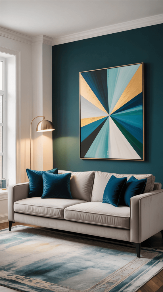 • Accessories: Think dark picture frames, a black metal floor lamp, or charcoal grey throw pillows. These small hits of darkness add visual weight and sophistication without closing the room in.