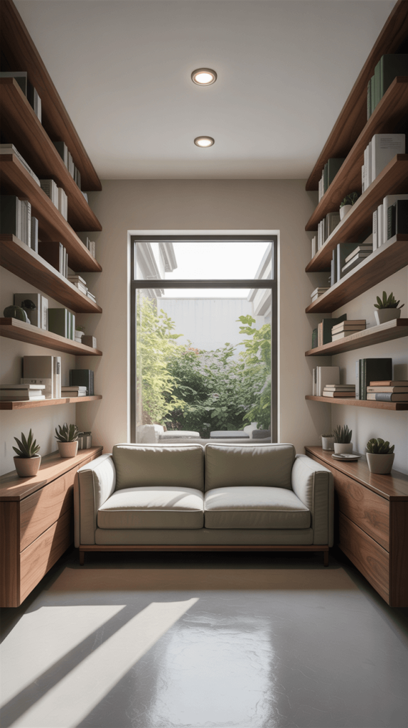 • Built-In Shelving & Cabinets: Filling an entire wall with floor-to-ceiling shelving and cabinets provides a massive amount of storage without jutting too far into the room. It becomes part of the architecture.